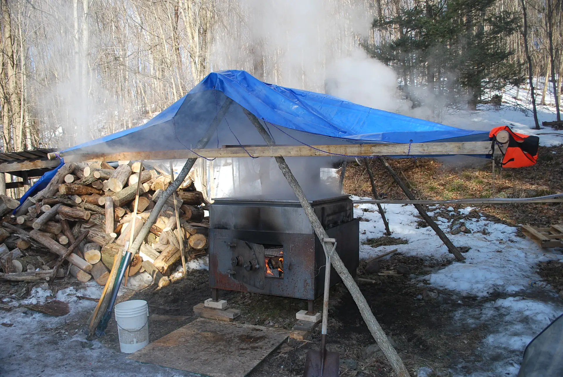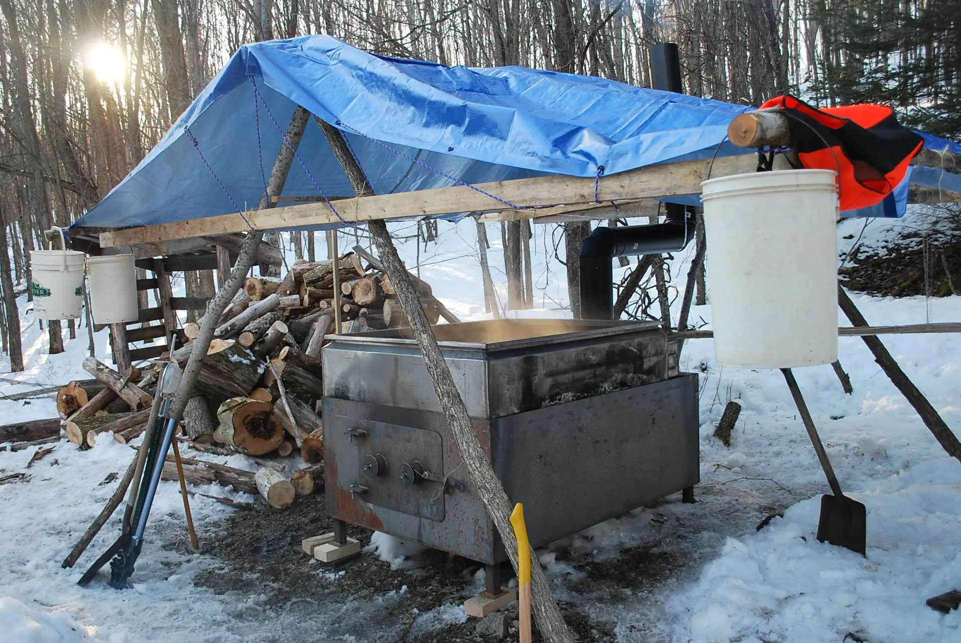 We started with a rugged setup: a used finishing pan and a homemade wood stove. We learned a lot in those early days! What started as just a few buckets quickly expanded to more than 300. It didn’t take long before we upgraded to a modern, high-efficiency wood-burning evaporator and vacuum pipelines. Each year, the operation has grown; we currently manage almost 2,000 taps on vacuum tubing, though we still hang a few traditional buckets for our visitors to enjoy.